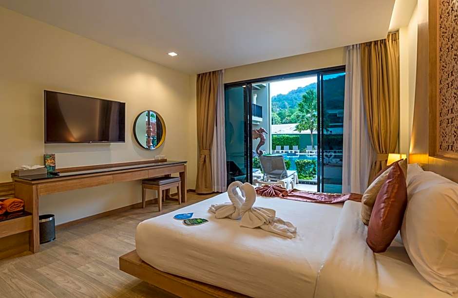 DELUXE POOL ACCESS ROOM is 344 square feet and includes either 2 single beds 80-130 width or a double bed 131-150 width.